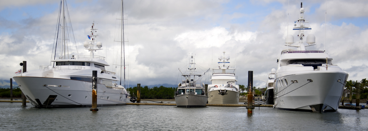 “med-moored between a pair of giant super yachts” and a 72′ (or 76′) Nordhavn moored behind you.
