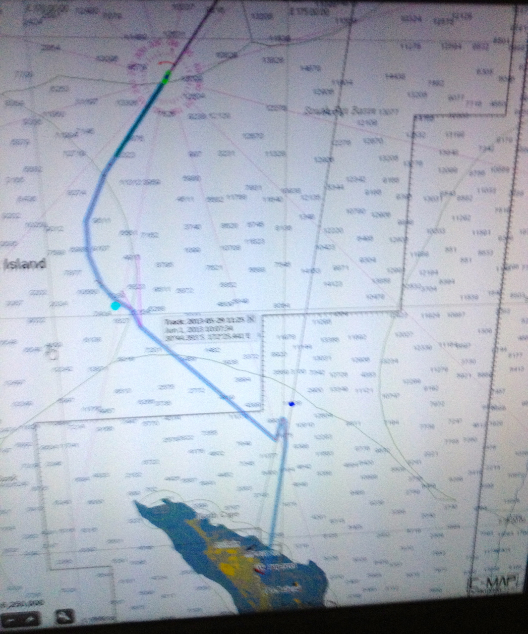 Here is much of our crazy track. The land mass at the bottom is New Zealand. Fiji is off the top of the displayed area, if you extend out the straight line we began with from New Zealand.