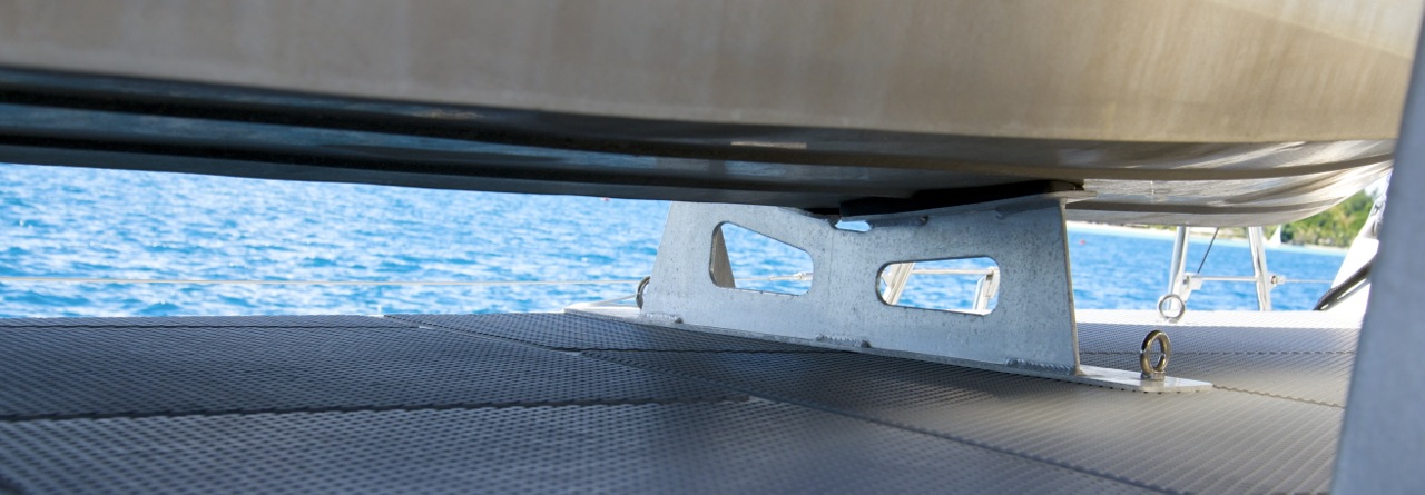 The pair of dinghy chocks affixes to the aft deck with eye bolts, making the chocks entirely removable should we opt for… oh, I don’t know… ballroom dancing on the aft deck in the moonlight?