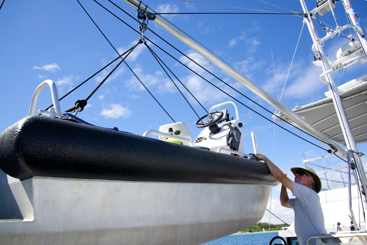 Here’s how we deploy Plug Nickel. I operate the remote-controlled electric winch on the aft deck, which raises and lowers the tender by its harness, rigged to the port side boom. The booms move freely from side to side (we control their tethering lines,) but do not move up or down.