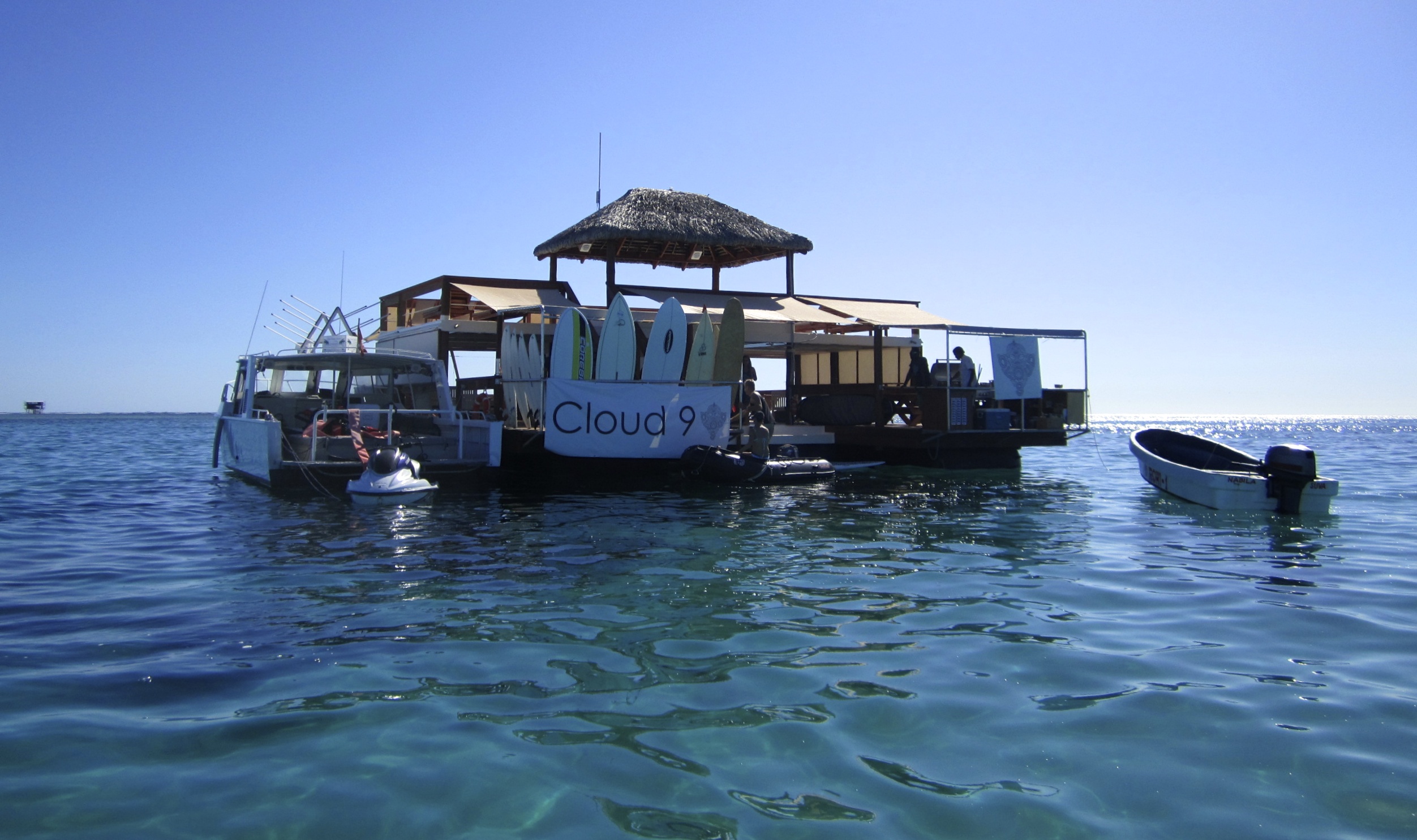 After our snorkel, we continued on past the reef another 15 minutes, toward the world famous ‘Cloudbreak’ surfing spot. Nearby, our destination was the newly launched pontoon oddity ‘Cloud 9.’ If John hadn’t known about it, it’s not the type of thing we would ever have stumbled upon, a speck in the ocean, enlarging ever so slowly as we approached. Think euro-style Teppan grill and chill bar meets Waterworld meets coral reef, miles from shore.