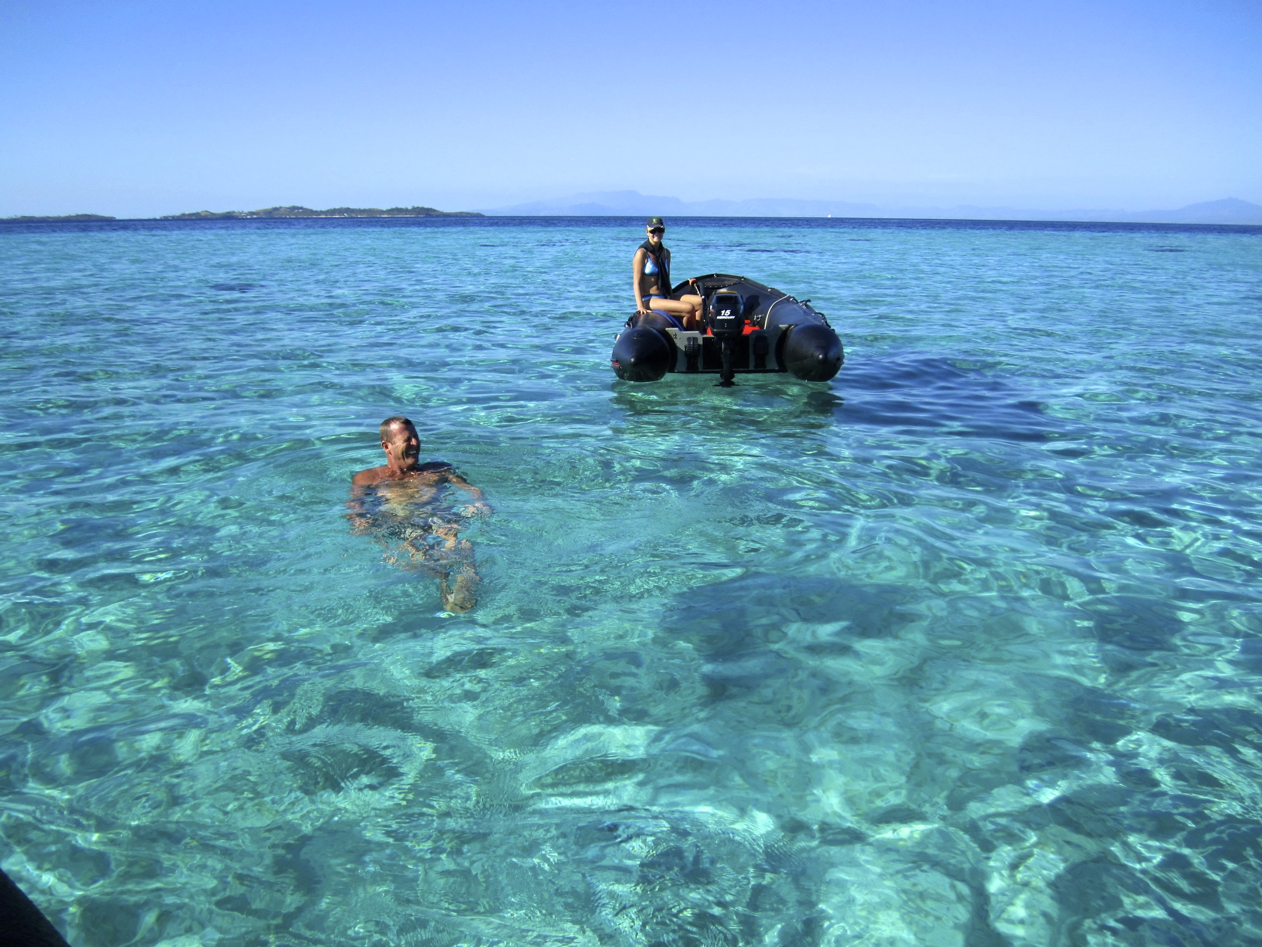 Dinghy driving is tough work for idle beach bums. At one point the gin-clear water just became too appealing, and John felt the need to jump in for a dip.