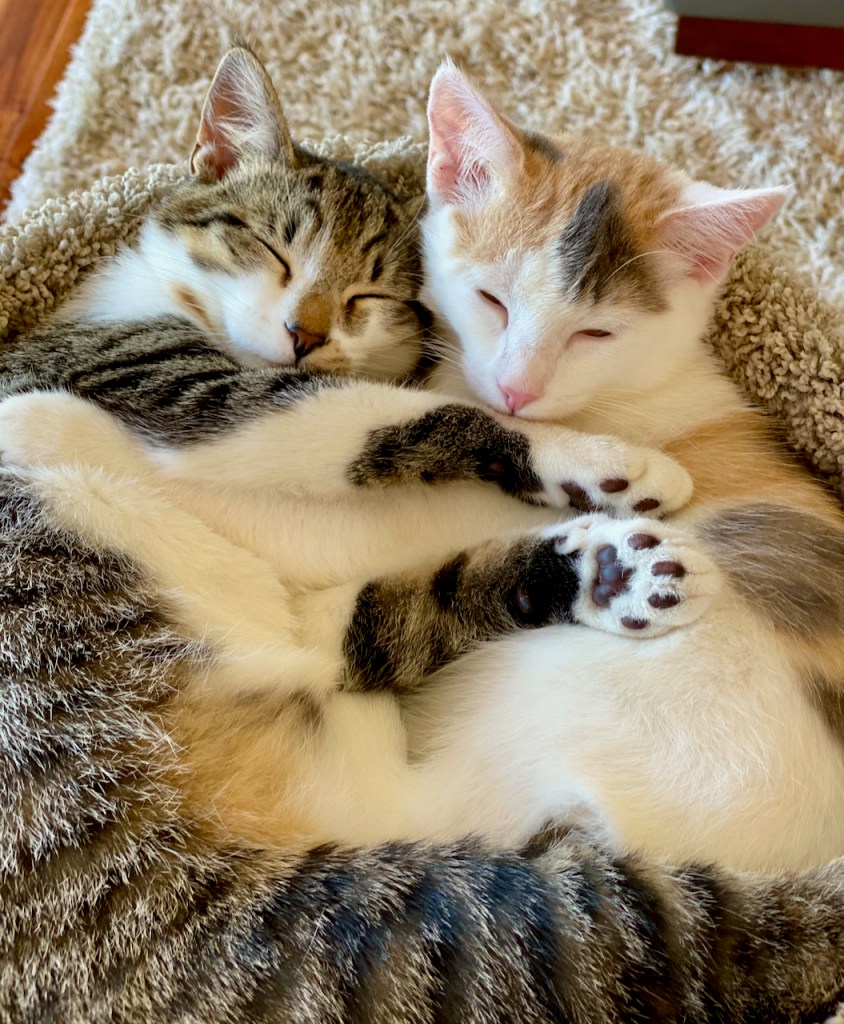 But the big news is……. drum roll…… we two retired veterinarians, pet-less since we moved aboard our first boat in 2006, went out and got two kittens. Ash is named after a character in the movie Alien. His “sister” (unrelated) is a tiny calico born with a short, kinked tail, so we named her Crooked Hillary. They bring us joy every day.