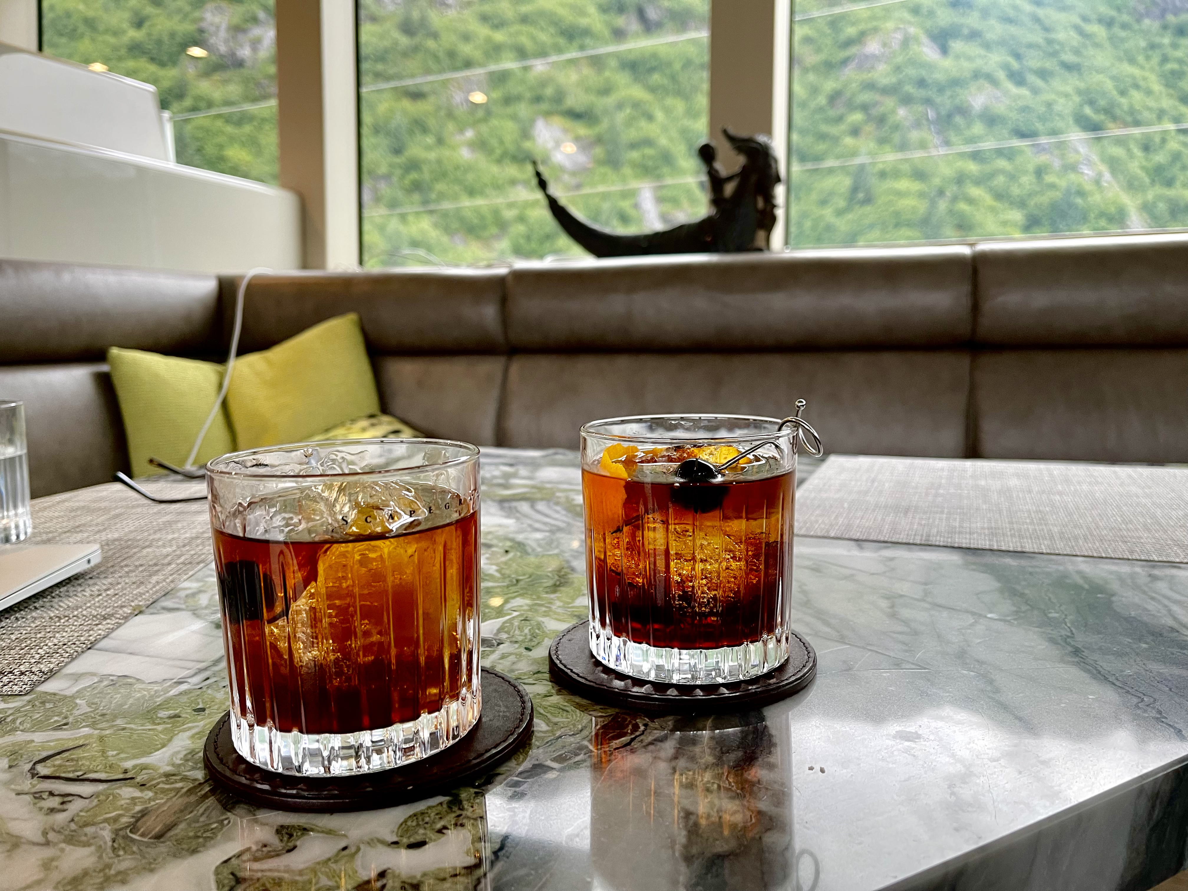 Speaking of cocktails, we had some fun, and most certainly some inexpert trial and error, collecting a very tiny iceberg (actually the small ones are called growlers, or bergy bits.) Stan sidled along one, and I stood on the stern with a net and a boat hook and tried to break off a chunk and pull it aboard. Pro tip: blocks of ice floating in the water are far heavier than they appear!