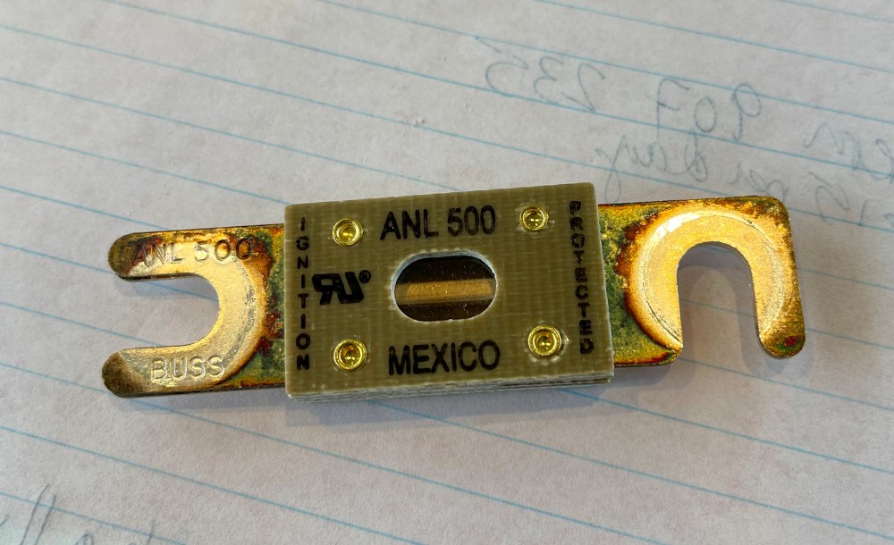 The pic below shows the 500 Amp whopper ANL fuse associated with our windlass. You can see through the window in the middle that it doesn’t look blown, the bridge appears intact. But the multimeter showed a lack of continuity.