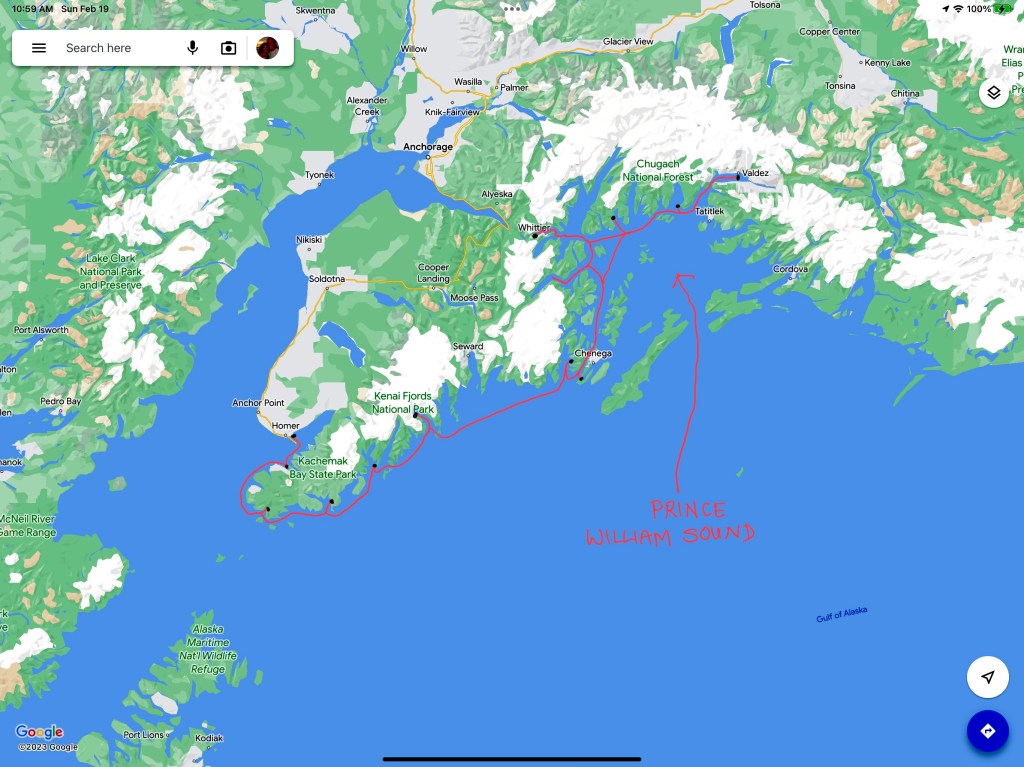 We spent the last few weeks of our short season doing a big fly-by loop from Homer, along the Kenai Peninsula on the coast of the Gulf of Alaska, into and around Prince William Sound, and then back to Homer.