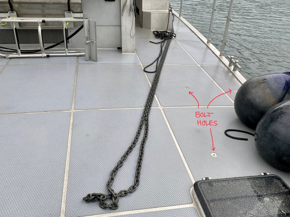 Stan thought he had a workable solution, using the power winch that I labeled in the pic above. The power winch is for line (rope) not chain, but our Buffalo has convenient bolt holes positioned at various points around the deck, and heavy eye bolts that screw into them. (I labeled some random bolt holes in a later pic.) So he screwed an eye bolt into a bolt hole just in front of our house window at the very aft of the foredeck, then attached a pulley to it. He tied a line to the anchor chain, ran it up to the pulley and back to the power winch. That allowed us to retrieve maybe 20 feet of chain or so at a time, then feed that chain down into the locker and repeat.