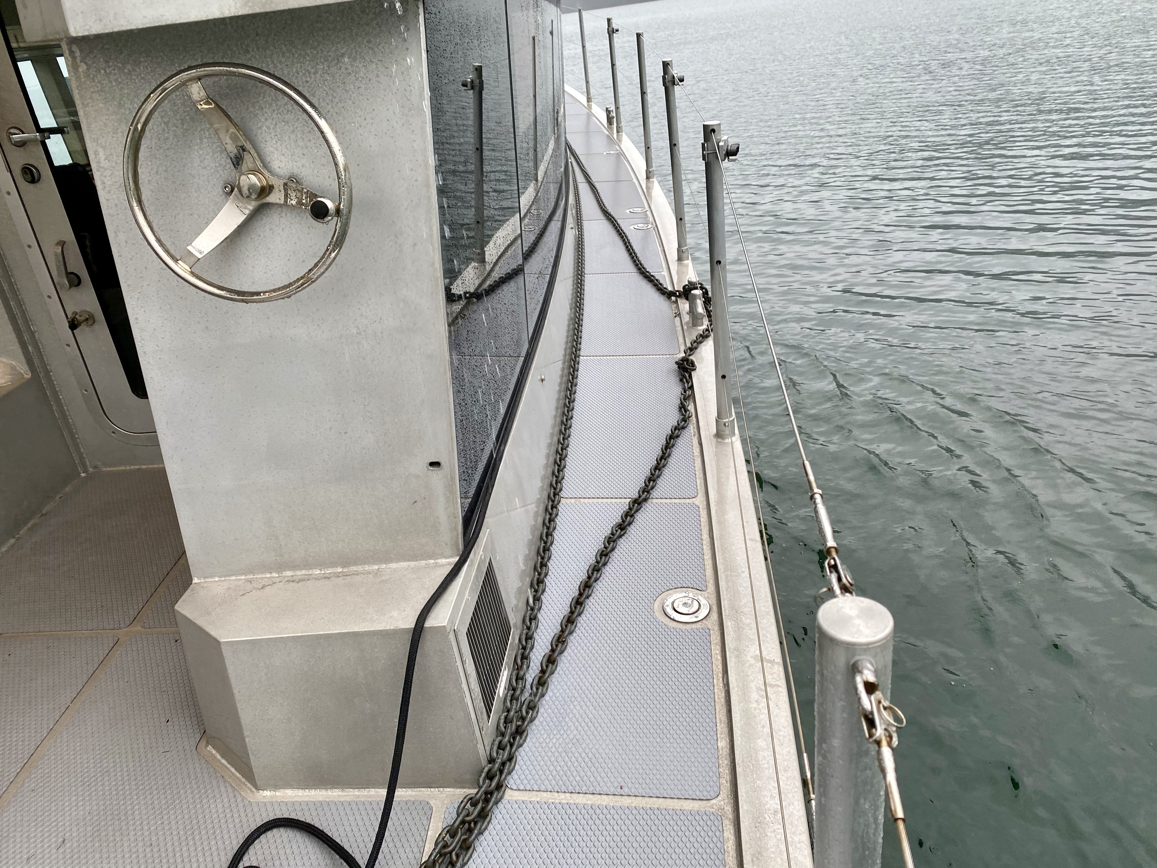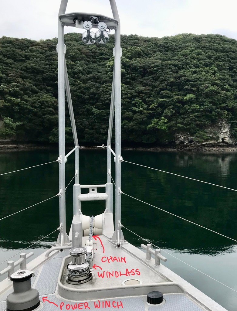 The pic above was taken while anchored in Japan, not Alaska, but it shows the forward part of our bow. The windlass is a powerful motorized device used to spool and unspool the chain from its location below in the chain locker. It’s how we deploy and retrieve our heavy ground tackle. And when I say heavy? Our anchor weighs 225 lbs, and our 330 feet of 7/16” chain weighs nearly 8 lbs per foot. We had around 230 feet of chain deployed which weighed around 1840 lbs. In other words, over 2000 lbs lying on the bottom of the anchorage, holding us in place.