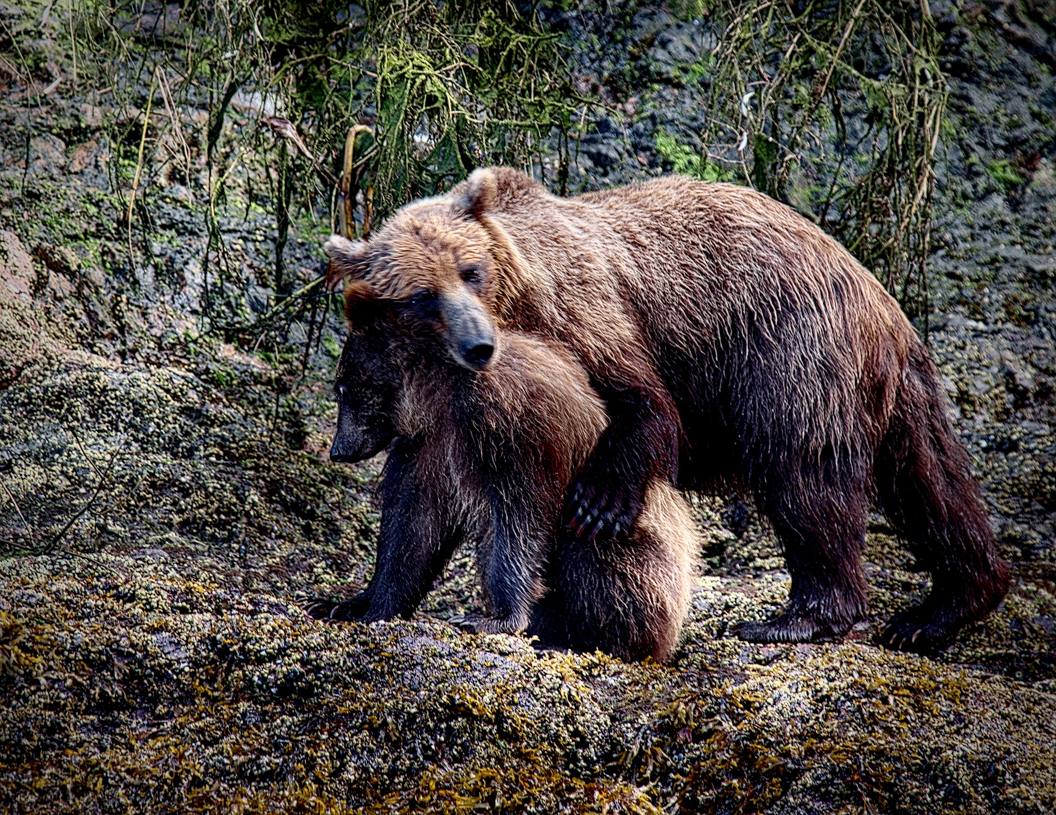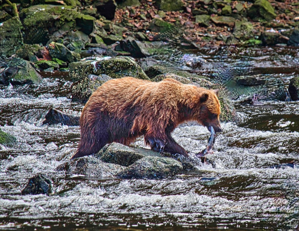 The bears here are never fed by humans, and are not tame. But they have become accustomed to the presence of small numbers of quiet people. With our guides instructing us, we slowly and silently made our way up the creek and sat down facing the river to watch the all-you-can-eat salmon feasting for several hours. It was marvelous. All ages and genders were represented.